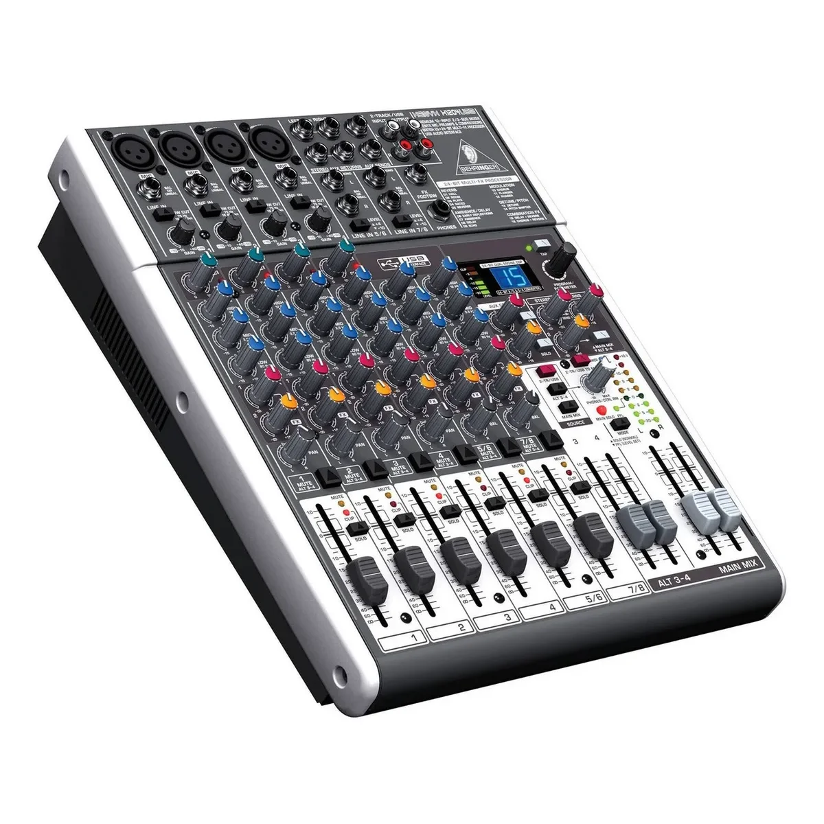 Equipada con 4 preamplificadores Xenyx en entradas XLR, ofrece un sonido limpio y con buen rango dinámico. Incorpora compresores en los primeros 4 canales para un control más preciso de la dinámica, junto con ecualización de 3 bandas con medios semiparamétricos, de estilo británico. Su módulo multiefectos digital de 24 bits incluye 16 presets como reverbs, delays, modulaciones y combinaciones, permitiendo procesar la señal sin necesidad de equipos externos. Además, cuenta con interfaz USB 2.0 para grabación directa en estéreo (L/R), facilitando la integración con DAW.